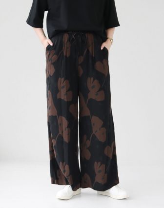 ブラウンとブラックの配色が秋の雰囲気を演出してくれるSACRAのフラワーパンツ。Tシャツを合わせてカジュアルな印象に♪足元はレザーのスニーカーを合わせてカジュアルになり過ぎないように意識してみました。