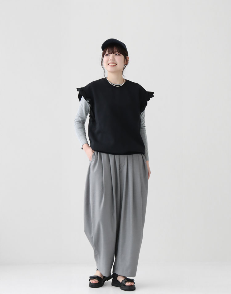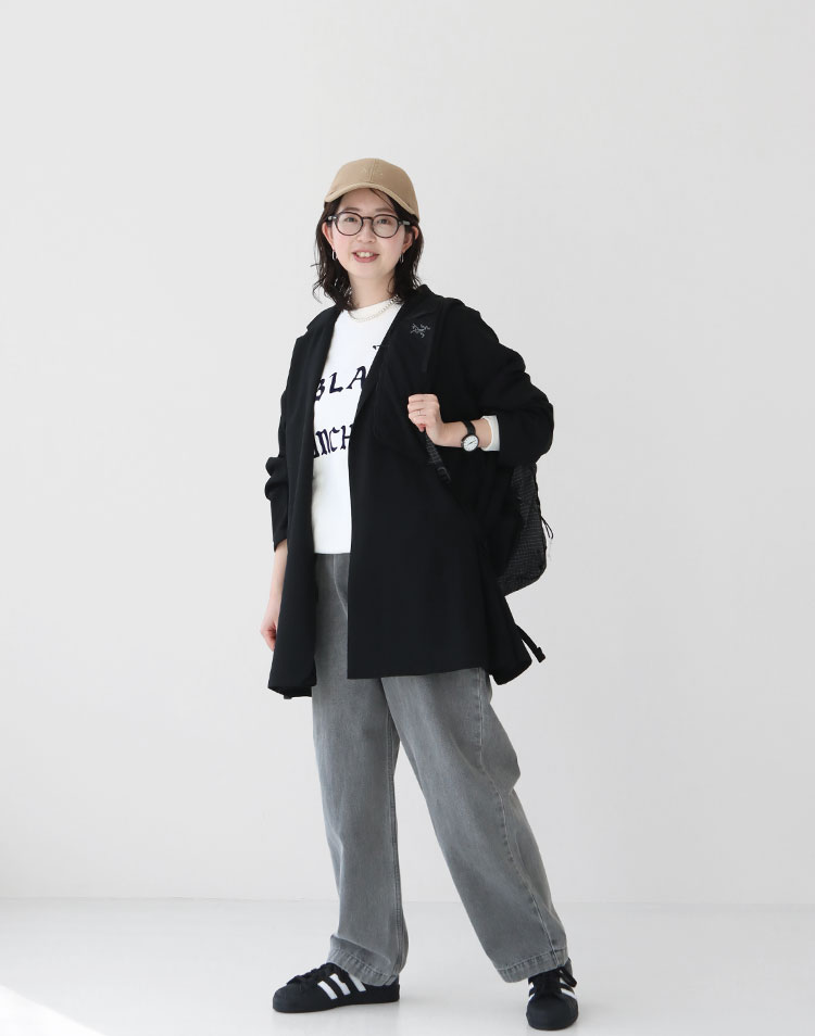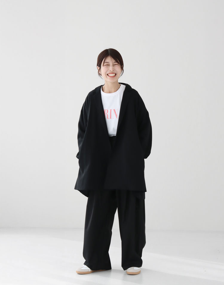 ジャケットのゆるさとパンツのややワイドなシルエットが、こなれた大人のカジュアルスタイルを演出。 カジュアルなお出かけにぴったりのコーディネートです。