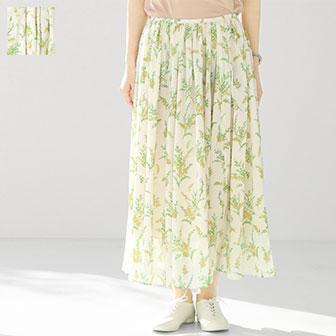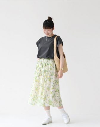 爽やかな色合いと程よい透け感で、夏のお出かけにぴったりなギャザースカート。 ふわっと広がるシルエットと花柄のプリントがフェミニンな雰囲気を演出♪ 女性らしいアイテムには外しでスニーカーを合わせることで、バランスの取れたコーディネートに仕上がりますよ!
