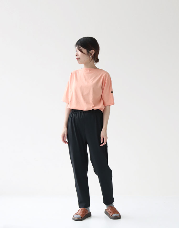ボートネックで首元を上品に魅せてくれるカットソー。 ピンクとオレンジを混ぜたような絶妙な色合いが可愛く、コーデを明るくしてくれます! 暗めのパンツに合わせて甘さを抑えることで、大人スタイルに仕上がりますよ♪