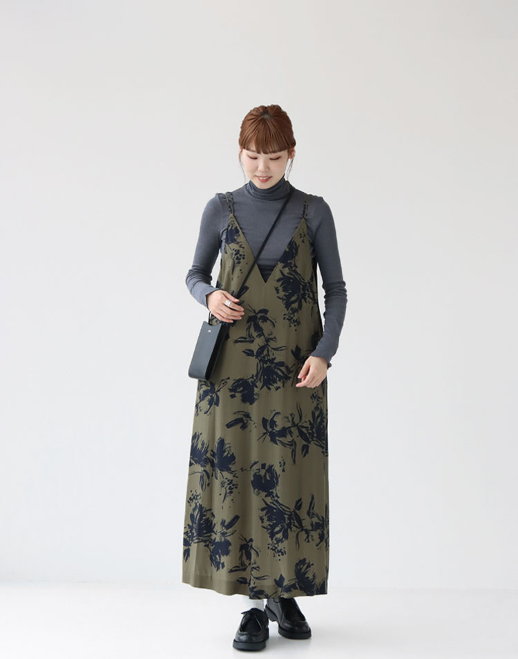 影のようなニュアンスの花柄が特徴で、存在感のあるキャミワンピース。 深いVネックラインと広がりすぎないシルエットが落ち着いた大人の雰囲気を演出します♪ Tシャツやブラウス、ニットなど合わせるアイテム次第で様々なスタイリングを楽しめますよ!