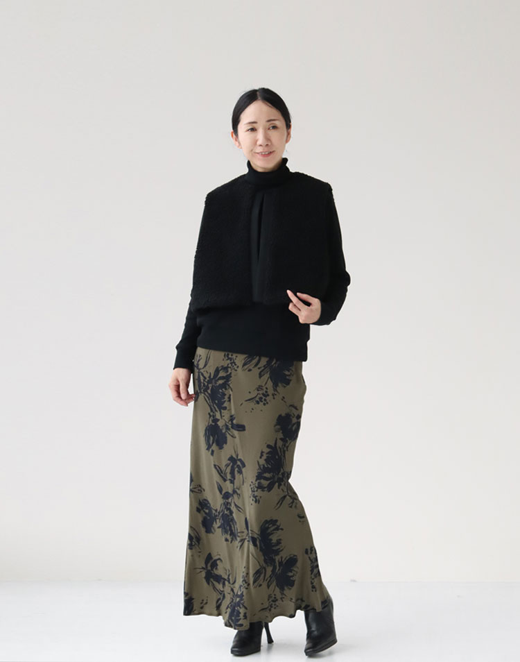 ブラックフラワーが上品な印象に見せてくれるサクラのスカート。 スタイルアップが叶う、細めのナローラインシルエットが◎ ボリューム感のあるボアベストを合わせても、すっきりとまとまった大人のきれいめコーデに! 春夏はカットソー、秋冬はニットなどに合わせたりと、シーズンレスで活躍する一着です。